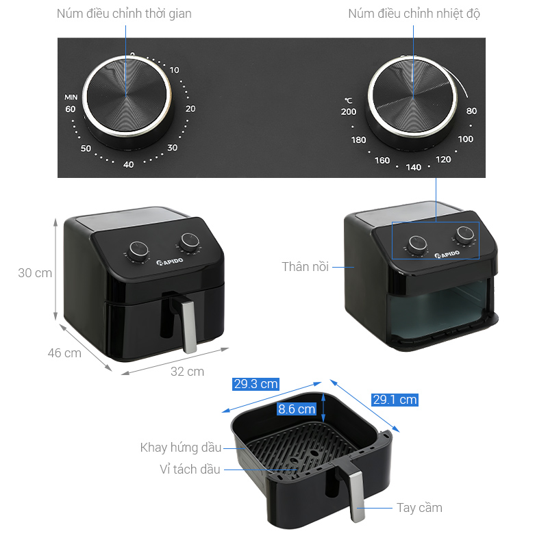 Thiết kế, chất liệu nồi chiên không dầu Rapido